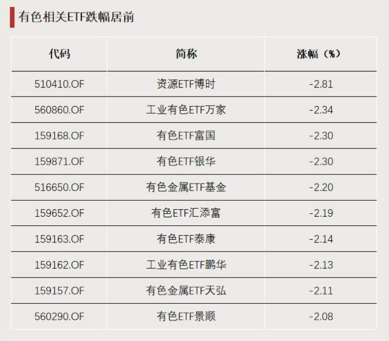 有色ETF跌幅居前。多只有色、资源相关ETF跌超2%。